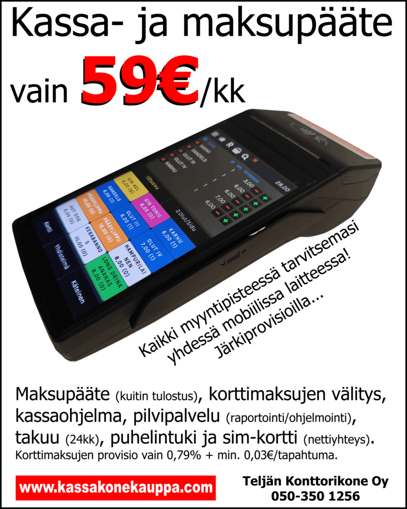 Haluatko käyttöösi nykyaikaisen, helppokäyttöisen ja toimintavarman maksupäätteen, jonka suurelta kosketusnäytöltä voit suoraan myydä kaikki yrityksesi tuotteet. Vaihtoehtoisesti Android-tabletilla tai 15,6 tuuman näytön omaavalla Android POS-päätteellä saat isomman kosketusnäytön tuotteiden myyntiin ja ilman lisä kuukausikuluja. Ostat vaan oman tabletin tai POS-päätteen. Edullisesti ilman määräaikaista pitkää sopimusta, tai määräaikaisella sopimuksella. Kattavat integroinnit ja maksutavat mahdollisia. Kaikki tarpeelliset raportoinnit ja ohjelmointi saatavilla helposti pilvipalvelussa. Soveltuu kaikille aloille. Lyhytaikaisesti vuokralle, tai pidempiaikaiseen käyttöön palvelupakettina.
